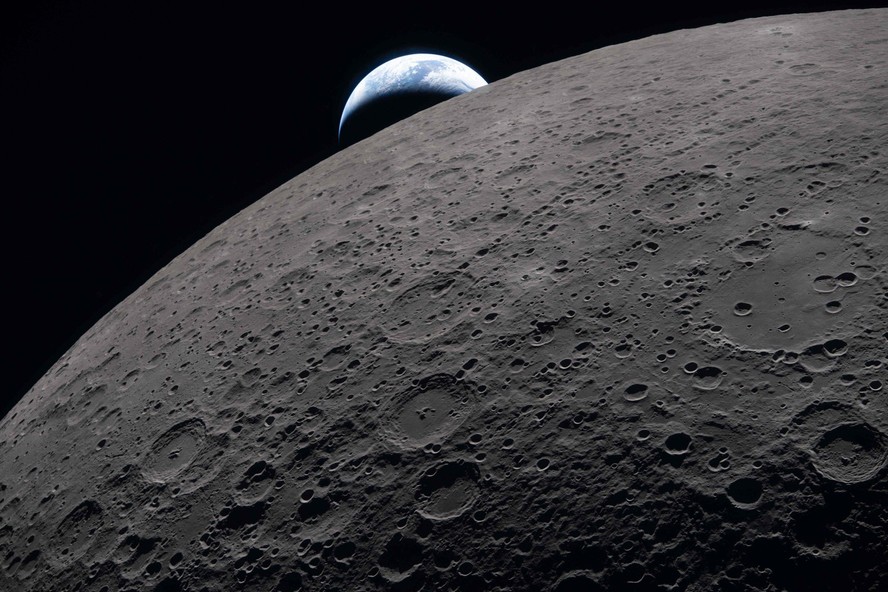 Imagem divulgada pela Nasa mostra a superfície lunar em primeiro plano,enquanto a Terra se põe ao fundo — Foto: Nasa/AFP